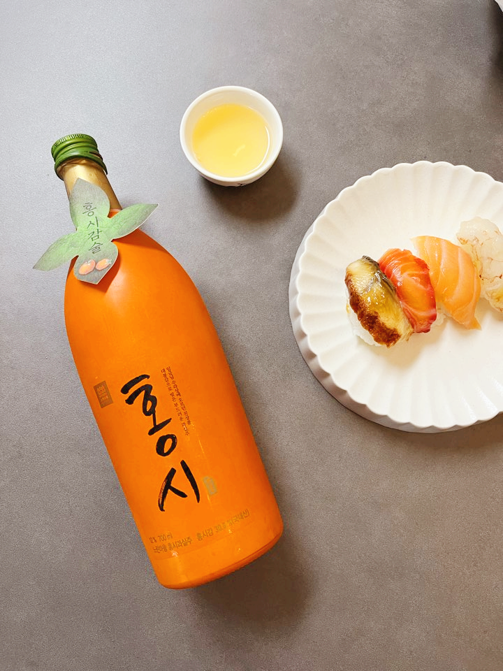 홍시 과실주는 감의 단맛을 농축시켜놓은 듯한 맛의 술이었는데요. 생각보다 산미가 있었고 끝에 12도의 도수가 꽤 존재감있게 느껴졌어요. 두 병이라 한 병은 피자와 한 병은 스시와 함께 즐겨보았는데요. 피자랑은 잘 안어울렸고 스시와의 조합이 좋았습니다. 최대한 시원하게 해서 드시는 것을 추천합니다.
