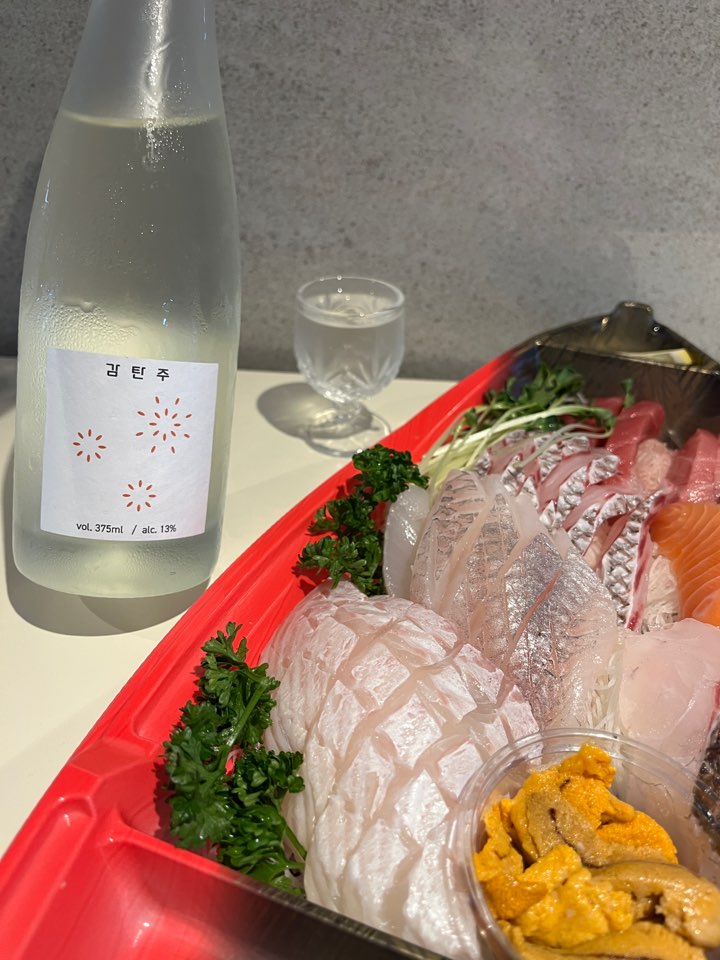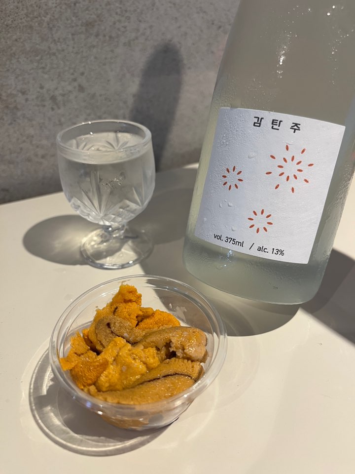 저는 모듬회 그리고 성게알과 함께 감탄주를 즐겨보았어요. 시트러스함이 가득한 술이라 생선회의 비린 맛을 싹 잡아주더라고요. 특히 성게알(우니)와의 페어링이 상당히 좋았습니다.