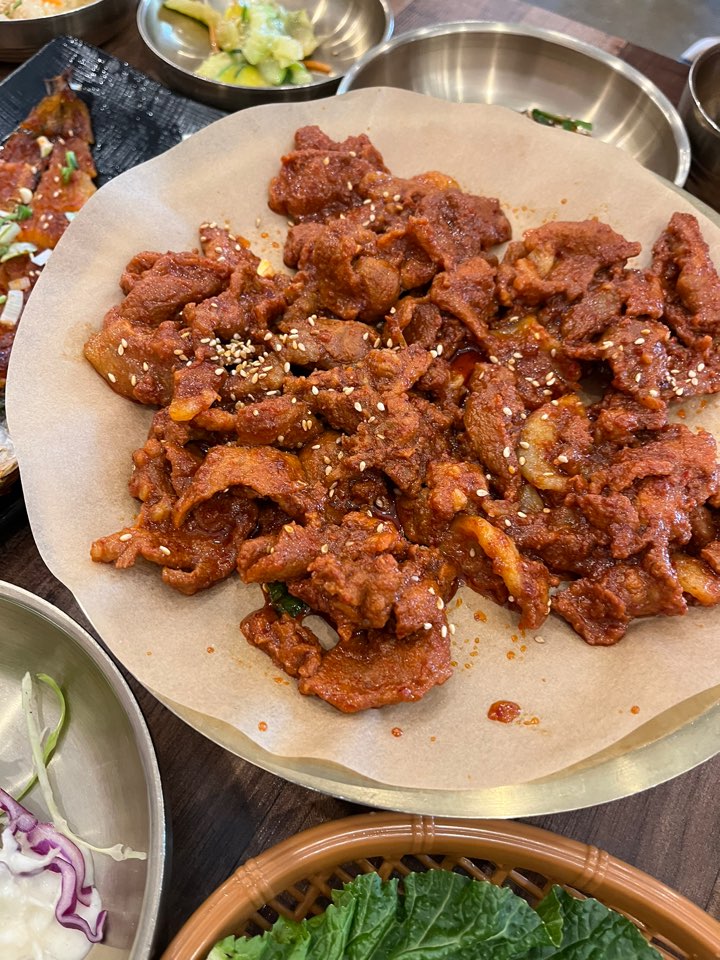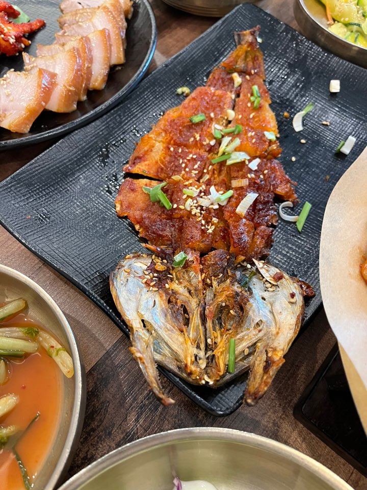 주문 후에 조리되기 때문에 음식이 나오는데 시간이 조금 걸립니다. 직화목살 양념구이는 매콤한 양념의 제육볶음같은 맛이예요. 접시 아래에 초가 있어서 먹는 내내 따뜻하게 먹을 수 있어서 좋았어요. 황태구이는 양념은 맛있었는데 살짝 질겼습니다. 여기 보쌈 맛집이군요. 보쌈이 아주 보들보들하고 맛있어요. 솥밥은 귀리가 들어간 흰쌀밥인데 누룽지가 아주 잘 눌어있어서 구수하게 먹을 수 있었습니다. 부족한 반찬은 셀프 반찬대에서 마음껏 가져다 먹을 수 있어요. 특히 쌈과 잡채를 맘껏 먹을 수 있어서 좋더라고요.