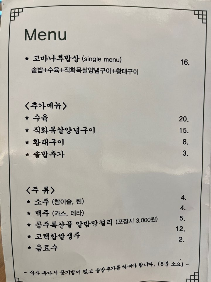 메뉴는 고마나루밥상(16,000원) 한 가지입니다. 이 메뉴는 솥밥, 수육, 직화 목살 양념구이, 황태구이가 한 상 차려지는 메뉴예요. 다양한 밑반찬도 함께 나온답니다. 초등학생 이상은 1인 1메뉴를 시켜야해요.