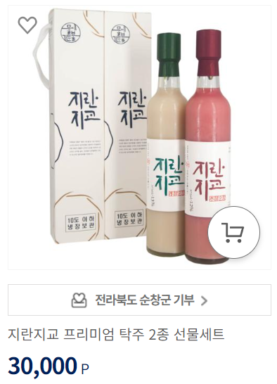 어느 지자체에 기부할지 고민이라면 답례품몰을 먼저 구경하시는 것도 방법입니다. 제품마다 지자체 기부 바로가기 버튼이 있어서 편리합니다. 저는 10만원을 기부해서 30,000P 이하의 전통주만 담아보았습니다. 제 장바구니 보여드릴게요.