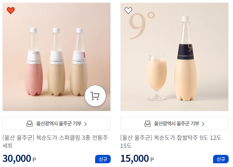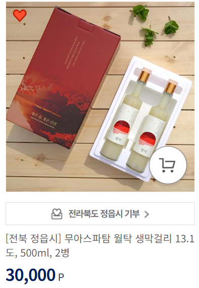 어느 지자체에 기부할지 고민이라면 답례품몰을 먼저 구경하시는 것도 방법입니다. 제품마다 지자체 기부 바로가기 버튼이 있어서 편리합니다. 저는 10만원을 기부해서 30,000P 이하의 전통주만 담아보았습니다. 제 장바구니 보여드릴게요.