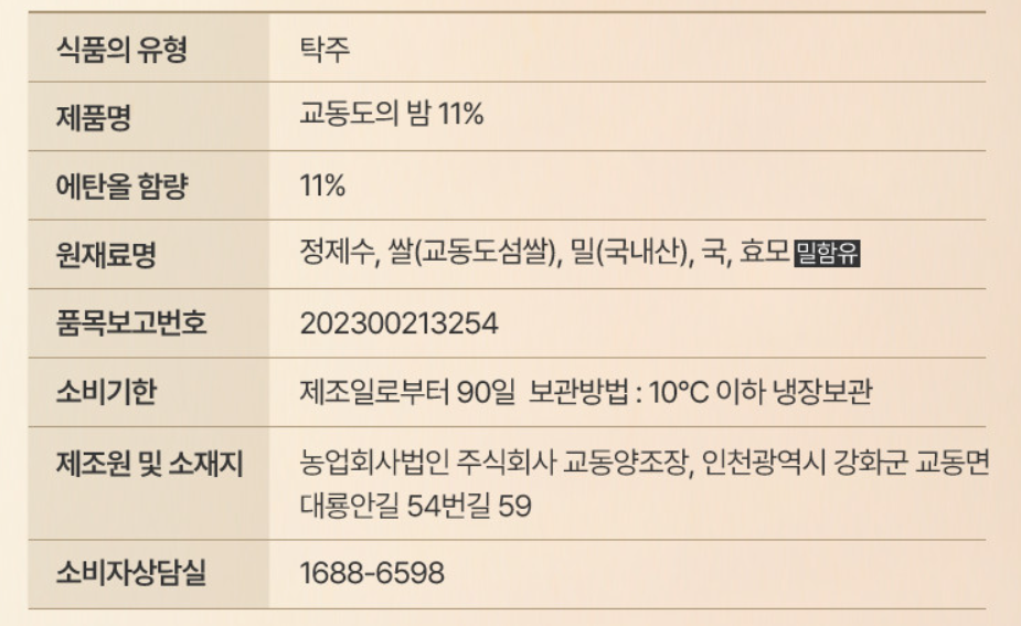 제품 스펙은 다음과 같습니다. 도수는 11도이며 심플하게 정제수, 쌀, 밀, 국, 효모만 들어가는 프리미엄 탁주입니다. 현재 온라인 판매가는 1병에 12,000원이네요.