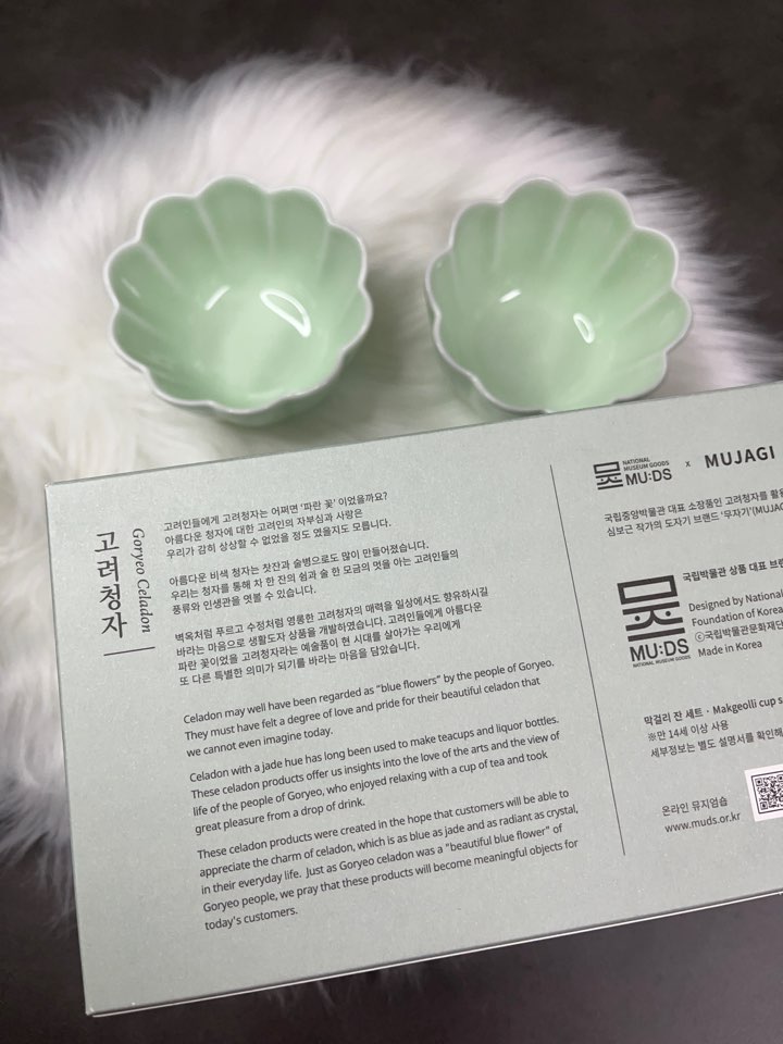 요즘 국립중앙박물관의 굿즈들이 많은 인기를 얻고 있죠! 그 중에서 저는 무자기와 뮷즈 협업으로 출시된 청자 꽃사발 막걸리 잔세트를 구매해 보았습니다.