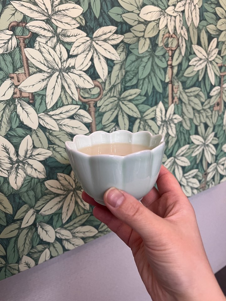 사진보다 실물이 훨씬 예쁜데요. 청자의 색감이 이렇게나 우아하다는 것을 깨달았어요. 꽃모양의 림 부분이 러블리한 느낌을 주며 광택감있고 매끄러운 표면의 촉감이 참 좋아요. 막걸리를 담으면 이런 모습입니다.