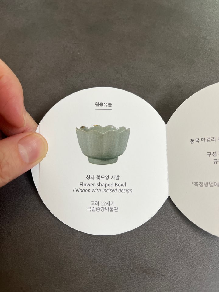 국립중앙박물관의 대표 소장품인 고려 청자를 활용하여 만들어진 청자 꽃사발 막걸리 잔세트인데요. 벽옥처럼 푸르고 수정처럼 영롱한 고려 청자의 매력을 일상 생활에서도 향유하길 바라는 마음으로 만들어졌다고 합니다.