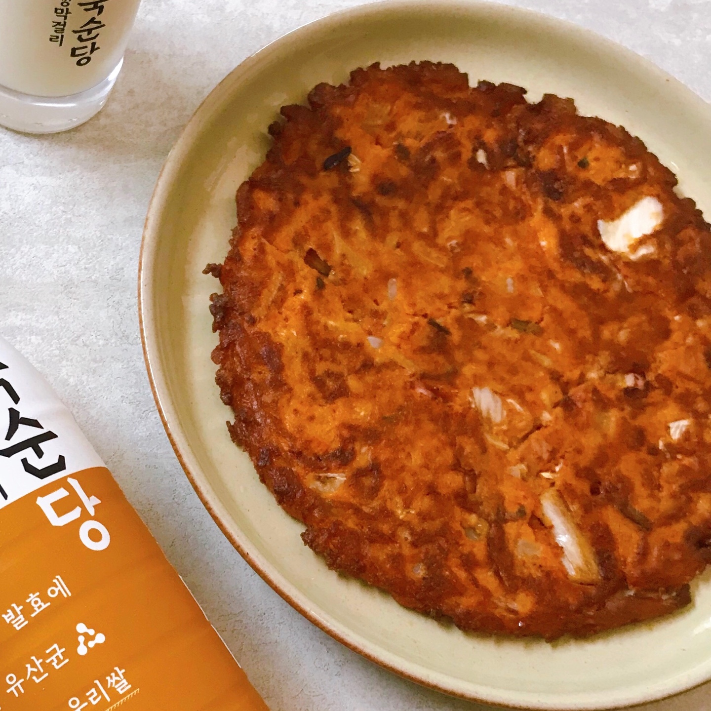 바삭한 김치전이 완성되었습니다. 김치전을 먹기 좋게 잘라 입에 넣으면, 바삭바삭한 식감과 느끼한 기름의 맛 그리고 중간중간 씹히는 고소한 오징어의 맛과 달큼한 양파의 맛이 너무나 조화롭습니다. 우국생 막걸리를 국순당 생 막걸리 전용잔에 가득 따라 쭉 들이킵니다. 이래서 막걸리의 베스트 프렌드는 김치전인가 봅니다. 설명이 필요 없는 맛입니다.