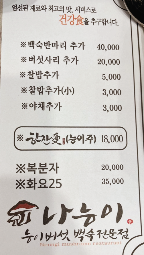 주류는 메뉴판에는 한잔애 능이주(18,000원), 화요25(35,000원), 복분자(20,000원)만 적혀있는데 주류 냉장고를 보니 막걸리, 맥주, 소주도 있었습니다.
