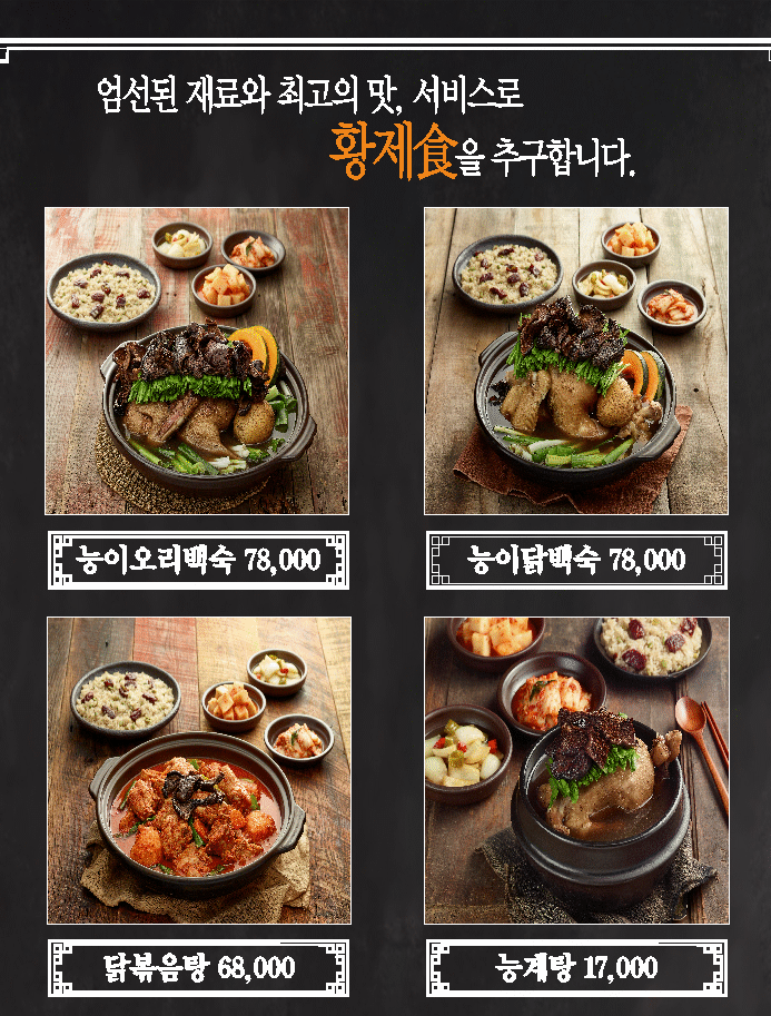 메뉴는 능이오리백숙, 능이닭백숙, 닭볶음탕, 능계탕(능이삼계탕)이 있습니다. 백숙 반마리, 찰밥, 야채, 버섯사리 등을 추가할 수 있어요.