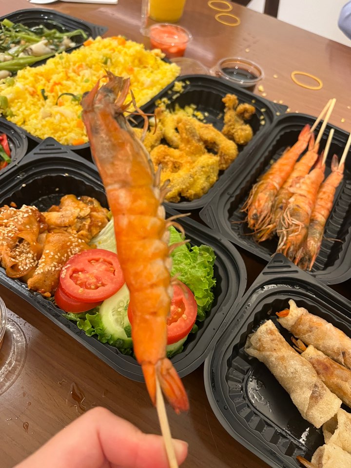 새우꼬치가 제일 인기 있었어요. 까기 귀찮긴 하지만 아이들 입맛에는 잘 맞았습니다. 오른쪽은 총알 오징어찜에 들은 오징어인데요. 한국에서 먹었던 총알오징어보다는 훨씬 작은데 내장이 하얗고 담백해서 별미였습니다.