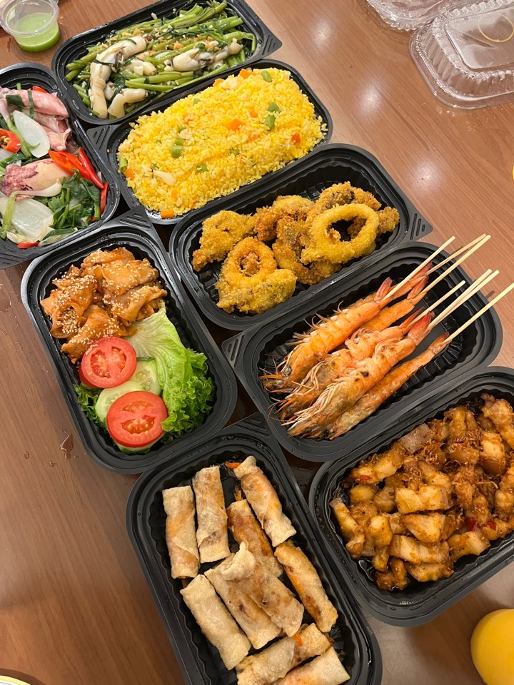 주문한 음식은 맛조개 모닝글로리볶음, 흰꼴뚜기 튀김, 새우꼬치, 해산물 볶음밥, 바비큐소스 삼겹살구이, 레몬스라스와 칠리를 곁들인 돼지고기, 총알오징어찜, 사이공 칠 맥주 2캔, 비나 맥주 2캔입니다.