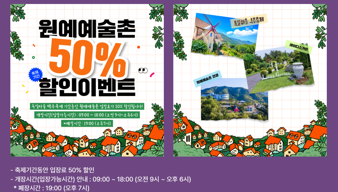 맥주축제 기간동안 원예예술촌 입장료가 50% 할인됩니다. 원예예술촌은 오전 9시부터 오후 6시까지 운영되요.