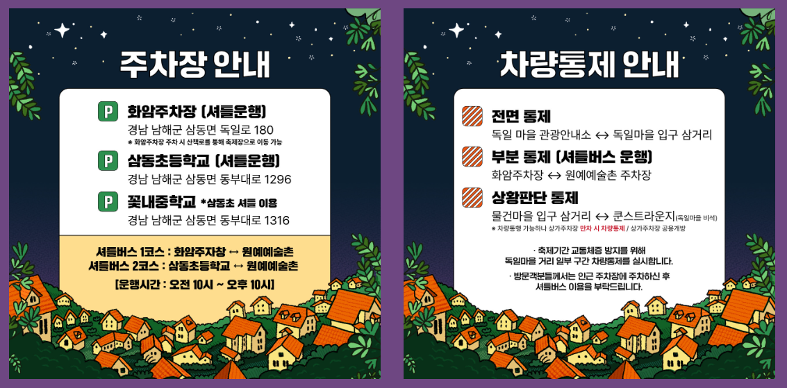 화암주차장, 삼동초등학교, 꽃내중학교에 주차가 가능하며 오전 10시부터 오후 10시 사이에는 셔틀도 운행됩니다. 독일마을 관광안내소에서 독일마을 입구 사거리까지는 차량이 전면 통제되니 주의하세요!