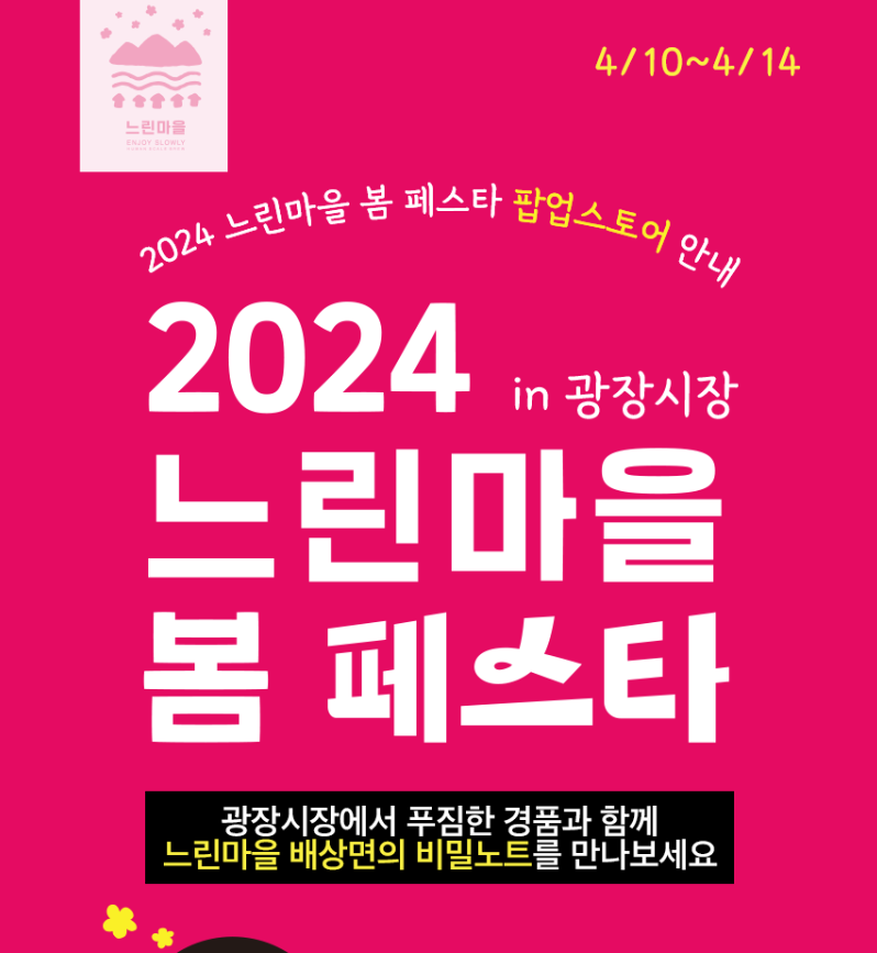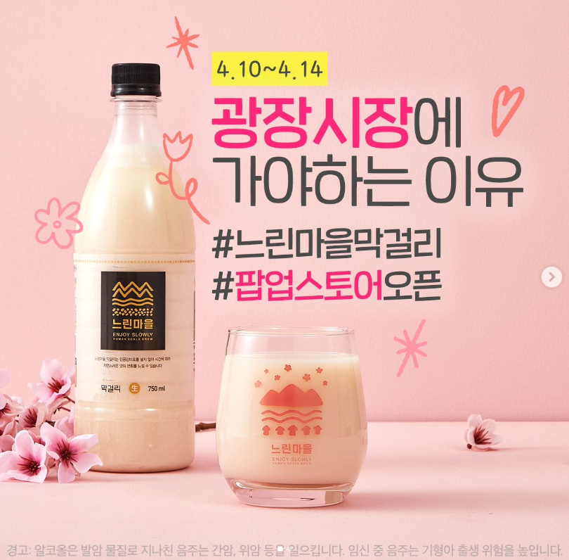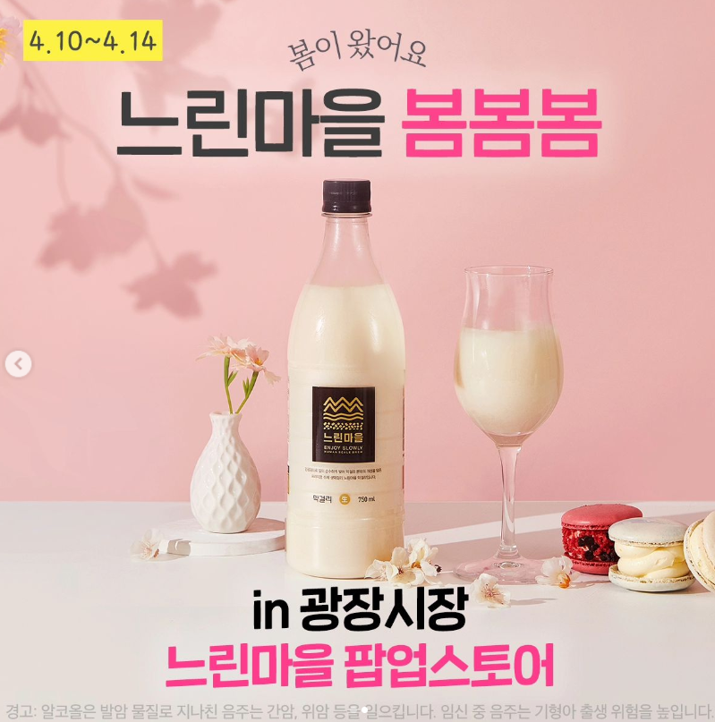 배상면주가의 느린 마을은 이번 4월 한 달간 온라인과 오프라인에서 2024 느린마을 봄페스타를 진행합니다. 그 중 오프라인 행사로 광장시장에서 팝업스토어를 열어요.