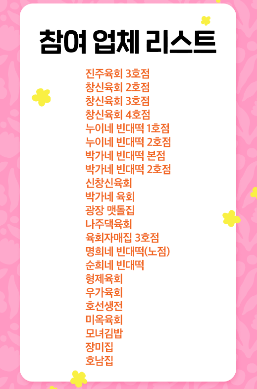자세한 내용은 나오지 않았는데요. 이번 팝업 스토어는 배상면 선생의 실제 레시피 노트를 모티브로 '배상면의 비밀노트'라는 콘셉트로 꾸며진다고 합니다. 또한 광장시장 내 업소와의 상생 전략으로 시장 내 막걸리 입점 업소들과 협업해 느린 마을 막걸리 '무 아스파탐' 병뚜껑을 가져오면 굿즈를 증정하는 이벤트도 진행할 예정입니다. 시장 내 참여 업체는 위의 이미지를 참고 바랍니다.