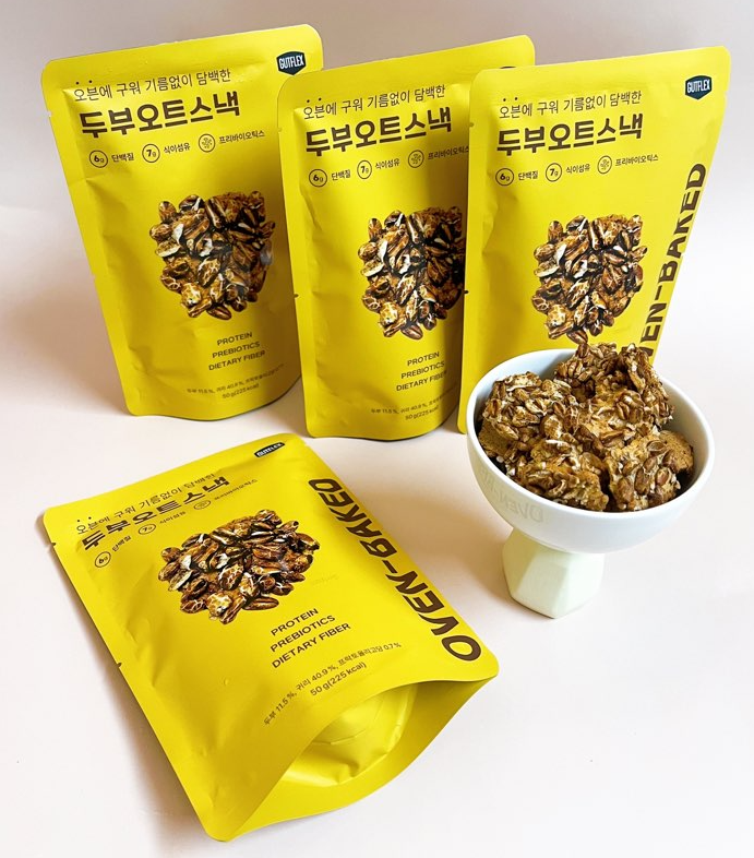 두부오트스낵은 이렇게 생겼어요. 영양 가득한 귀리(오트)를 토핑으로 올려 건강한 영양소와 포만감까지 한 번에 챙길 수 있는 단백질과 식이섬유가 풍부한 스낵입니다. 한 봉지가 50g이고 그 안에 두부 11.5%, 귀리 40.9%, 프락토올리고당 0.7%가 들어있으며 칼로리는 225kcal입니다. 단백질 6g, 식이섬유 7g, 프리바이오틱스가 들어있다고 해요.
