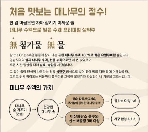 담 the original은 물 대신 대나무 수액으로 빚은 세상에 없던 술(약주)입니다. 2024 대한민국 주류대상 청/약주 부문 대상을 수상하였습니다.