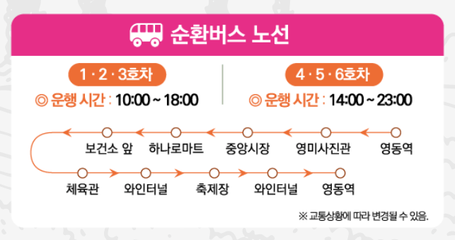 대중교통 이용시, 자가용 이용시 오시는 길입니다. 영동역에서 축제장까지 순환버스도 운행됩니다. 노선은 위의 이미지를 참고해 주시고 글씨가 잘 안 보이는 경우는 아래 링크를 눌러 확인해 주세요.