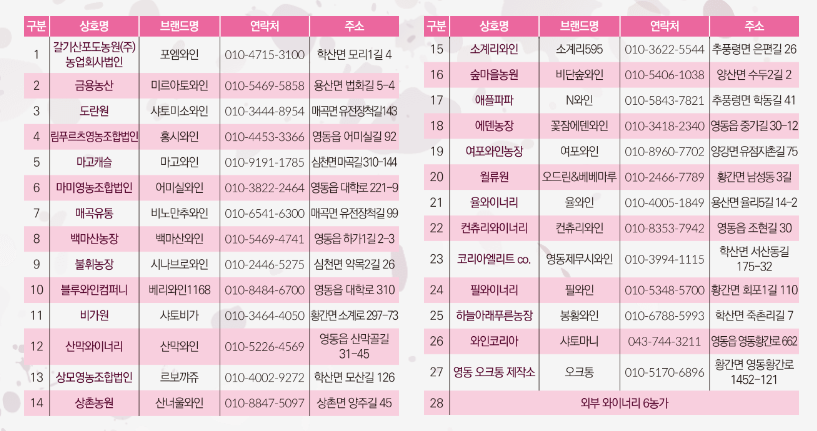 충북 영동에 위치한 와이너리들이 정말 많습니다. 와이너리 위치와 함께 대표 연락처가 정리되어 있는 영동 와이너리 지도는 아래의 바로가기에서 확인해 주세요.