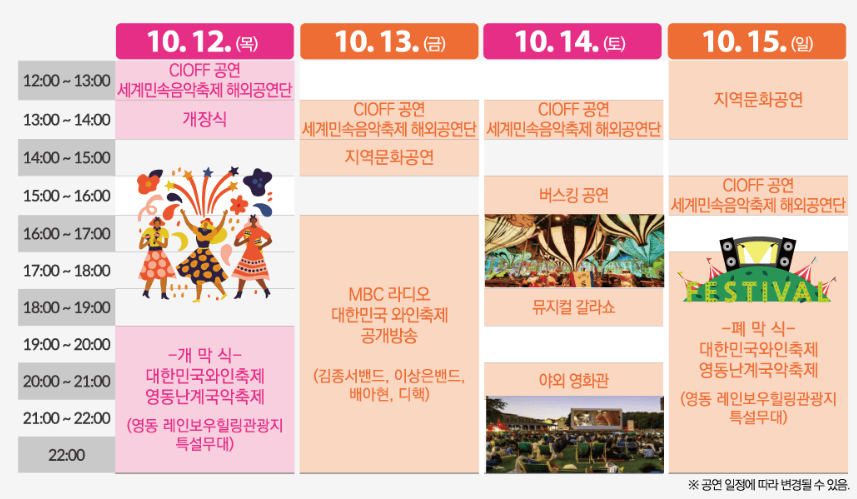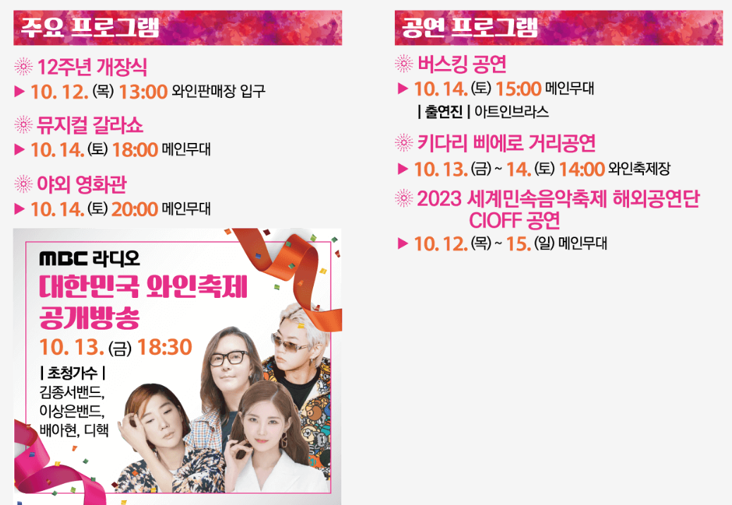 대한민국 와인축제는 해외공연단의 공연을 시작으로 12시부터 개장합니다. 첫 날은 개장식 및 개막식 프로그램이 준비되어 있으며 이후 자세한 일정은 아래 일정표를 참고해 주세요.