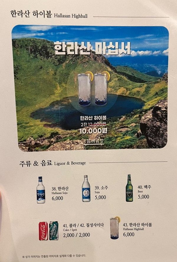 정식 메뉴는 반상 메뉴보다 푸짐한 한상차림 메뉴인데요. 2인 이상 주문이 가능합니다. 4인 이상 주문 시에는 10% 할인됩니다. 주류는 제주 한라산 소주, 맥주, 한라산 하이볼이 판매중이네요. 한라산 하이볼의 경우 한 잔에 6천 원인데 2잔 주문 시 10,000원으로 할인됩니다.