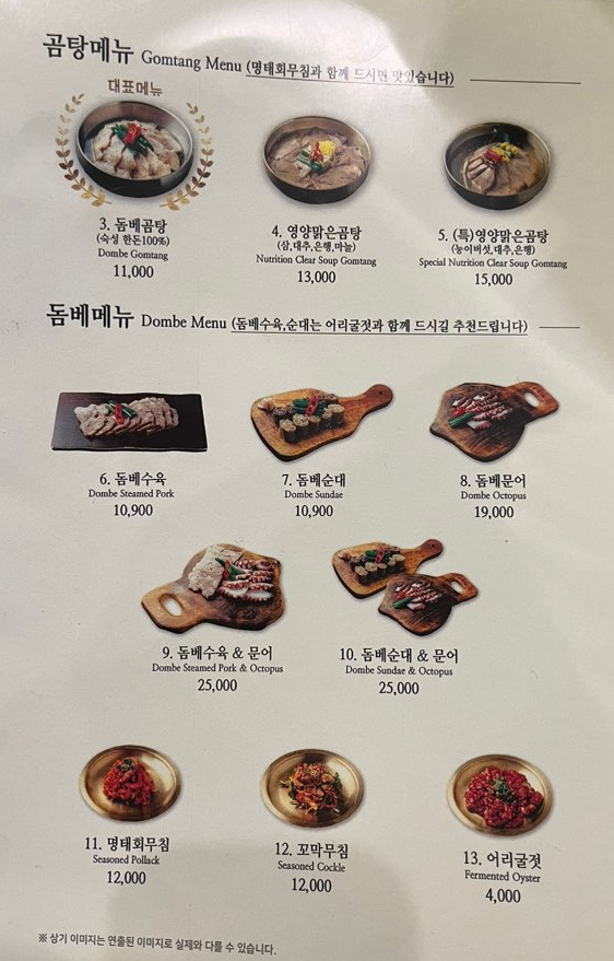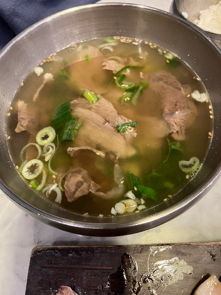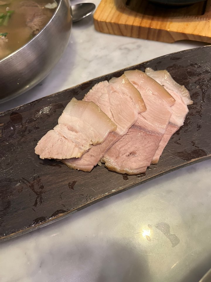 영양 맑은 곰탕에 고기가 정말 많이 들어있네요. 또한 약재향이 진하게 나서 정말 몸보신되는 느낌의 곰탕이었어요. 함께 나오는 돔베고기는 얇고 부드러워서 새우젓을 올려먹으니 담백하고 아주 맛있었습니다.