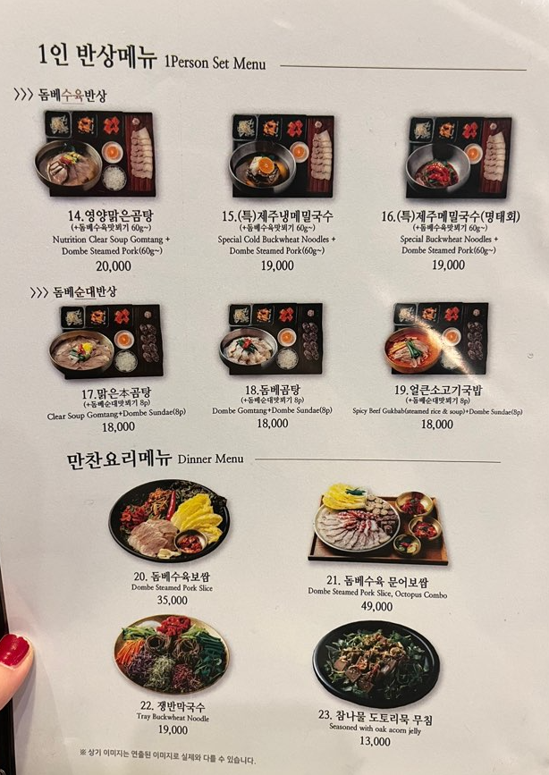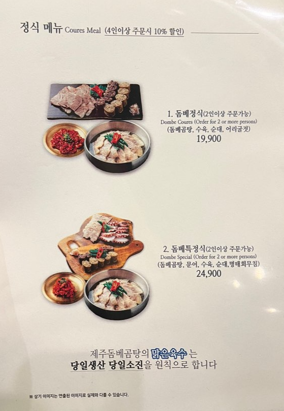제주돔베곰탕은 곰탕과 돔베고기 뿐만 아니라 메밀국수, 막국수, 꼬막 비빔밥, 김치찌개, 순두부찌개 등 다양한 메뉴가 있어요. 다양하게 먹고 싶다면 반상메뉴, 간단히 먹고 싶다면 식사메뉴 중에서 고르는 것이 좋겠습니다.