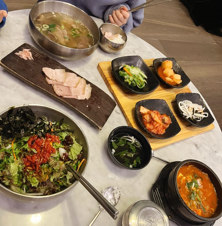 영양 맑은곰탕 반상(20,000원), 제주 메밀국수(12,000원), 한돈 김치찌개(10,000원)를 주문했습니다. 반상 메뉴에는 돔베고기와 밑반찬 4종이 함께 나와요. 제주 메밀국수는 간이 살짝 약한 느낌이어서 슴슴한 맛을 좋아하시는 분들에게 좋겠습니다.