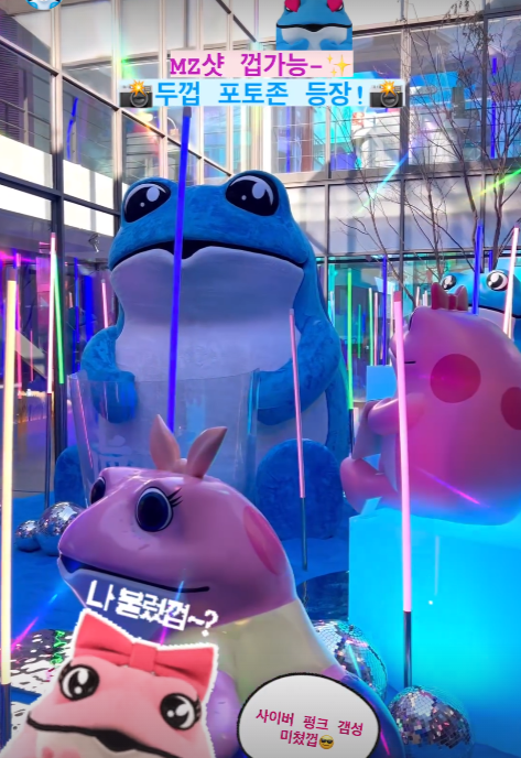 건물 전면을 클럽 같은 화려한 색감으로 꾸몄으며 두꺼비 조형물로 시선을 끌고 있습니다. 특히 1층 야외 중정에는 다양한 두꺼비 조형물을 두어 사진찍기 좋게 꾸며놓았다고 합니다. 또한 초예술적인 네온 아트월도 훌륭한 포토존이네요.