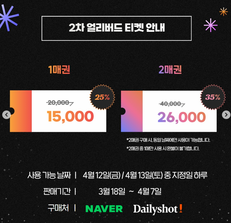 4월 7일까지 2차 얼리버드 티켓이 오픈되었습니다. 4월 12일, 13일 중 지정일 하루 이용 가능한 티켓이며 1매는 25% 할인된 15,000 원, 2매는 35% 할인된 26,000 원에 구매할 수 있습니다.