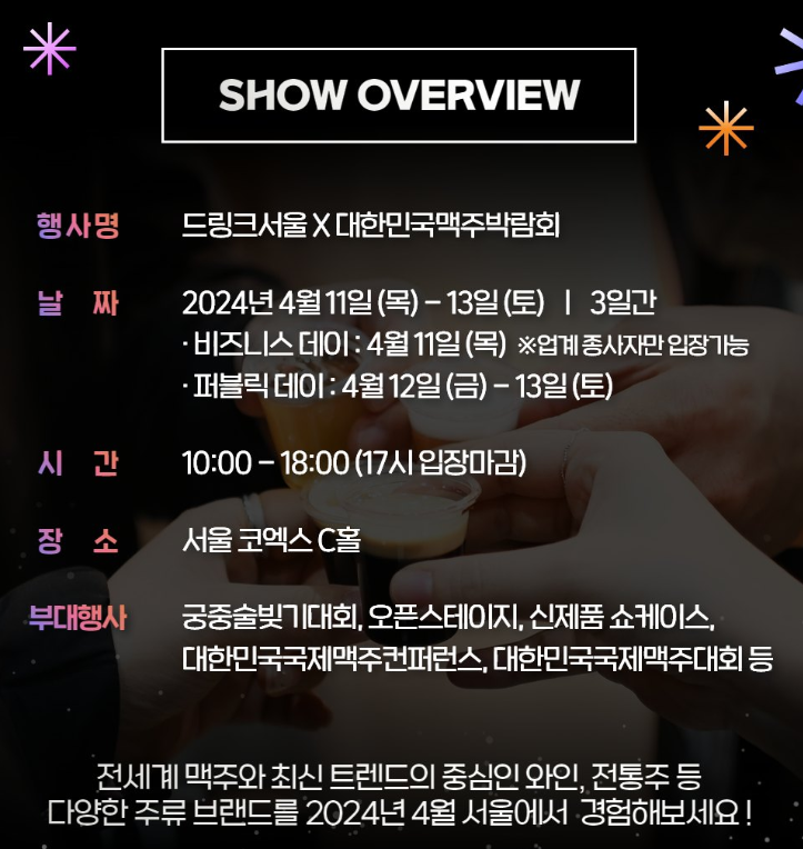 3일간 코엑스에서 진행되는 드링크서울 2024. 대한민국맥주박람회와 함께 동시개최되는 만큼 풍성한 주류박람회가 될 것 같습니다. 저도 너무 가보고 싶네요!