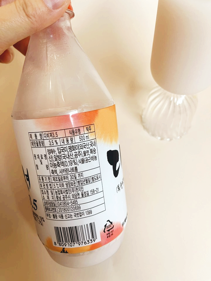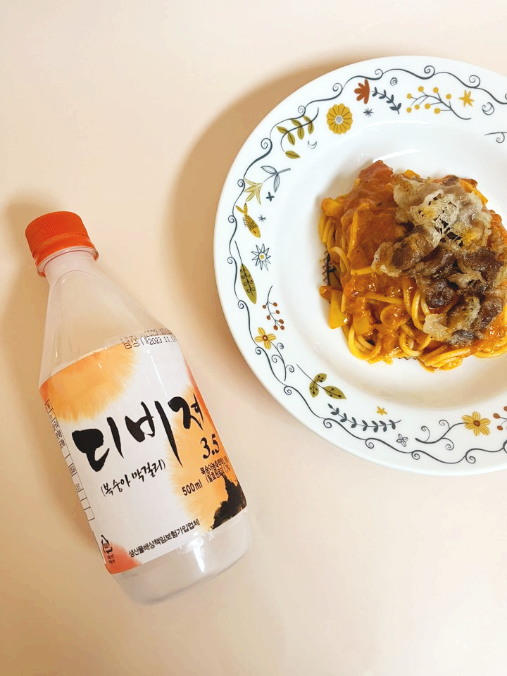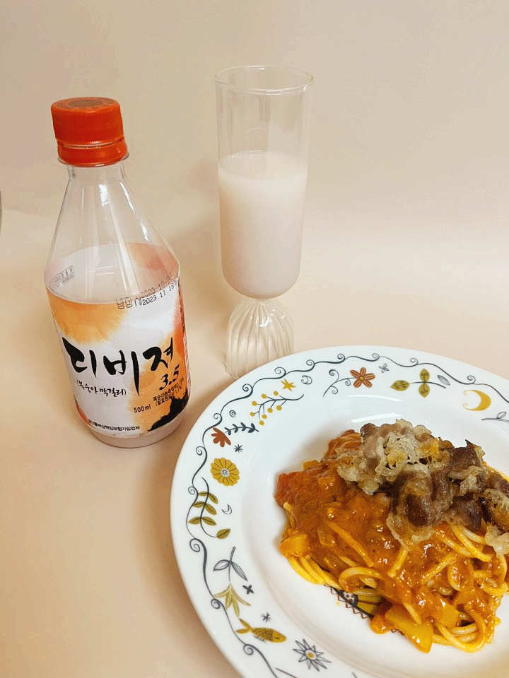 저는 우삼겹 라구 파스타와 함께 마셔보았습니다. 디비져 막걸리는 실제로 마셔보니 첫맛에 복숭아맛이 살짝 나면서 알밤 여운이 꽤나 길게 남는 막걸리였어요. 성분표를 보지 않아도 알밤이 느껴져요. 제품 설명에서 보신 것처럼 알밤과 복숭아를 정말 절묘하게 섞었네요. 도수가 3.5도라 알코올감은 거의 느껴지지 않습니다.