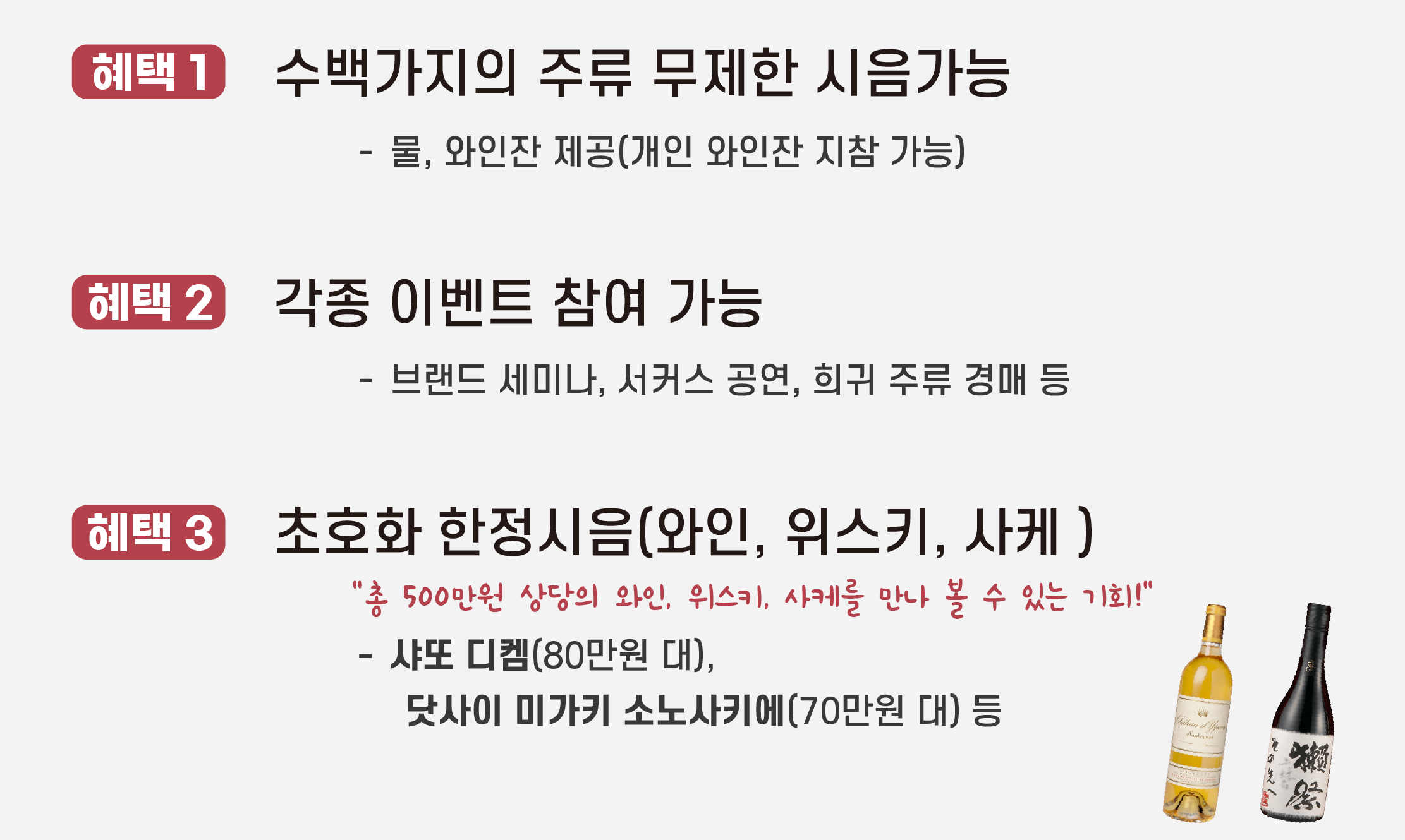 제2회 디오니 주류 박람회에 가야 하는 이유입니다. 우선 수백 가지의 주류가 무제한 시음이 가능하다는 것입니다. 또한 각종 브랜드 세미나, 서커스 공연, 희귀 주류 경매 등 다양한 이벤트가 기다리고 있습니다. 마지막으로 가장 기대되는 부분인데요. 샤또 디켐(80만 원대), 닷사이 미가키 소노사키에(70만 원대) 등 초호화 주류를 시음해 볼 수 있는 기회가 제공되기 때문에 이번 디오니 주류박람회는 꼭 가보셔야겠습니다.