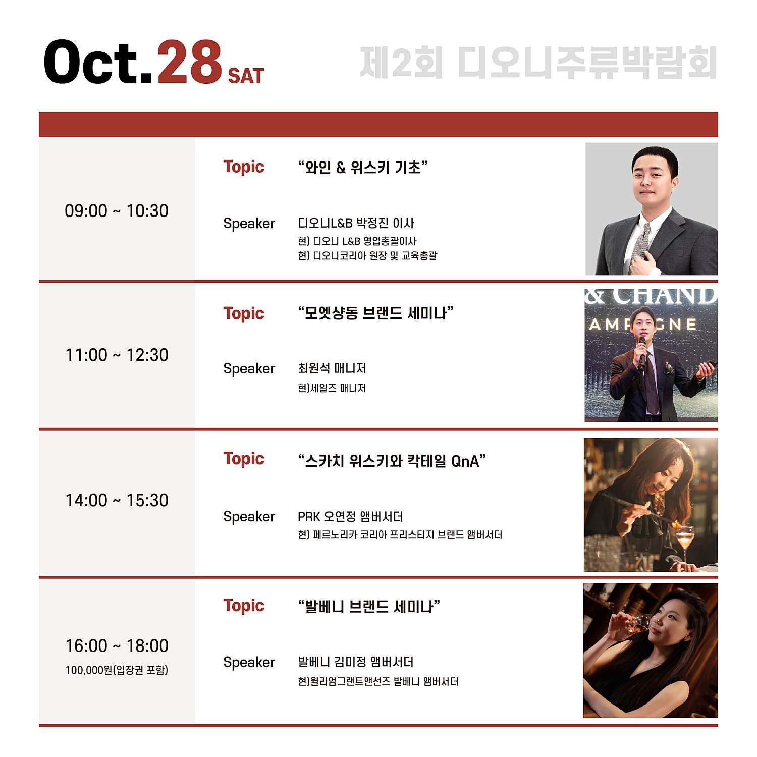 현재 28일의 경우는 발베니 브랜드 세미나만 예약 가능하며 29일은 맥켈란 브랜드 세미나와 누룩과 우리술 강의가 예약 가능합니다. 마감되면 현장에서는 예매가 불가하니 미리 사전예매 링크에서 예약하세요.