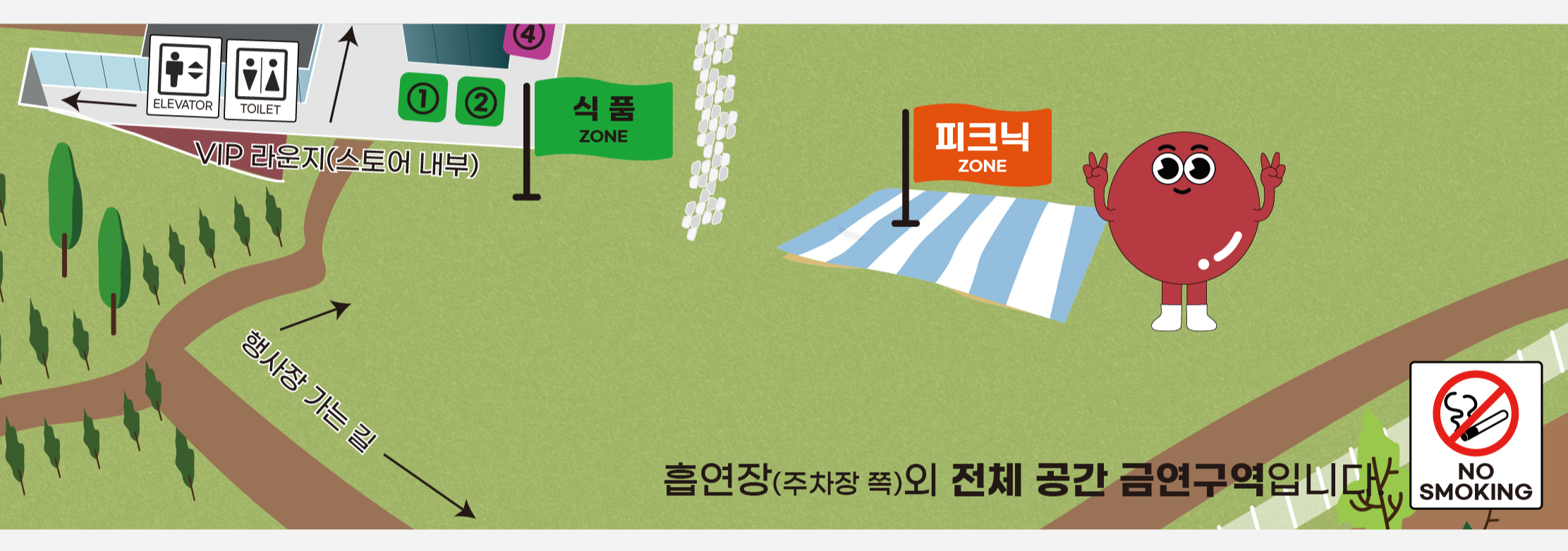 피크닉존은 선착순 자율 이용이며 외부 음식은 반입금지입니다. (유아용 식품은 가능해요.) 의자나 테이블은 반입이 가능하지만 경사가 있어 사용하기 불편할 수 있습니다. 이용 후 뒷정리 필수입니다.