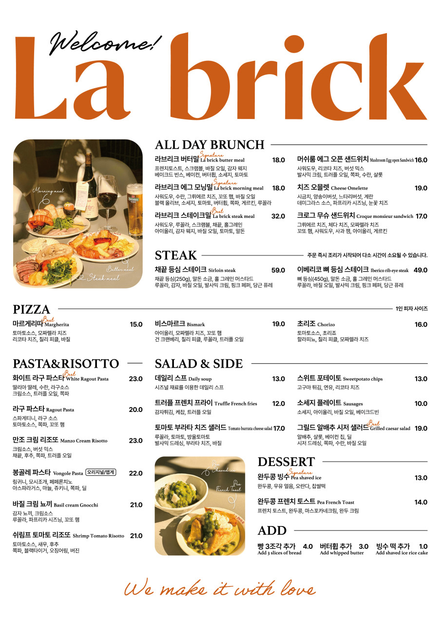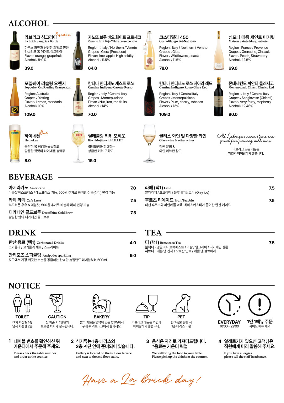 하루종일 주문 가능한 브런치 메뉴부터 스테이크, 피자, 파스타, 리조또, 샐러드, 디저트까지 다양한 메뉴가 준비되어 있어요. 주류는 샹그리아, 와인, 하이네켄 생맥주, 모히또 등이 있으며 음료는 커피, 탄산, 차가 있습니다.