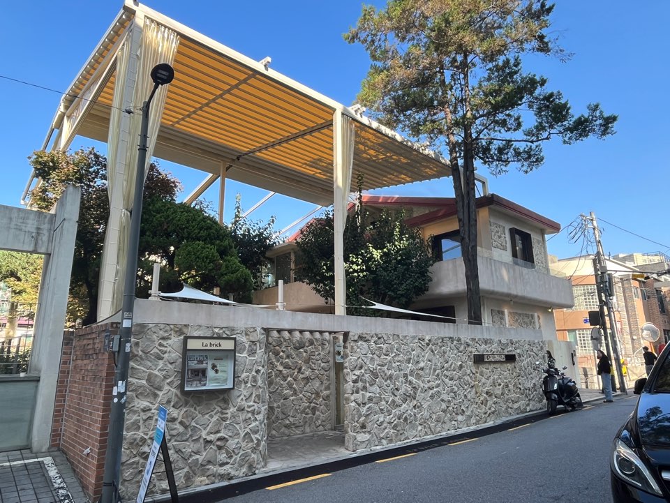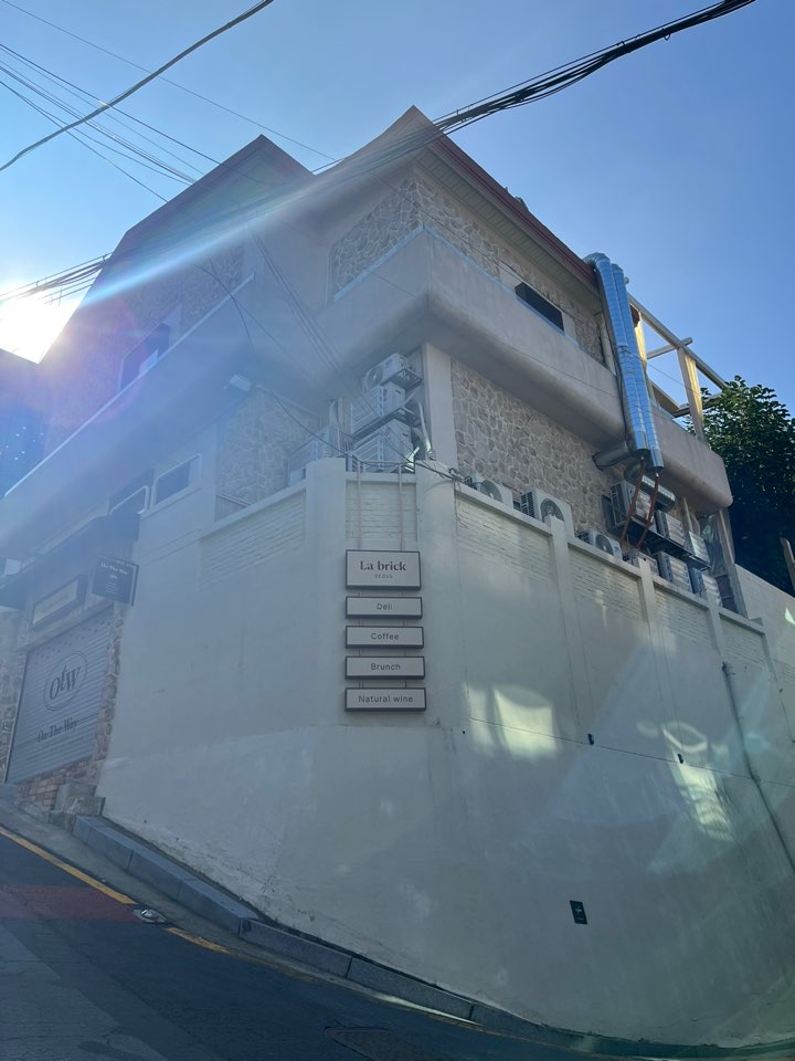 강남역의 가파른 언덕에 위치한 라브리크 외관입니다. 벽돌로 꾸며진 아이보리빛의 건물이 고급스러운 느낌을 주고 규모가 굉장히 웅장합니다.