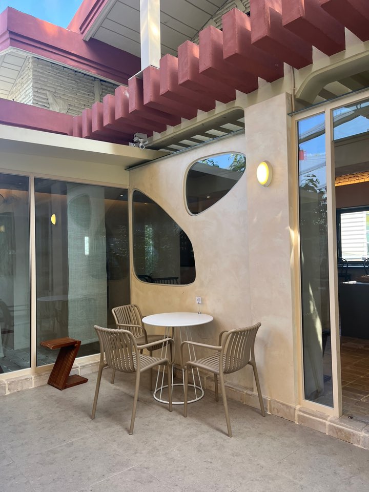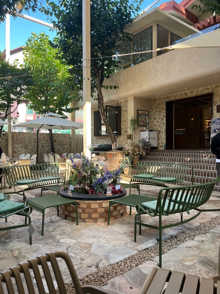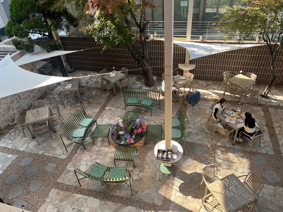 2층입니다. 2층에는 룸도 있고 실내 좌석이 몇 테이블 있었어요. 테라스 좌석도 있고요. 2층에서 내려다본 1층 마당의 모습입니다. 평일 10시 반에 방문했는데도 벌써 두 팀이나 와 계셨어요. 주말에는 훨씬 많겠네요.