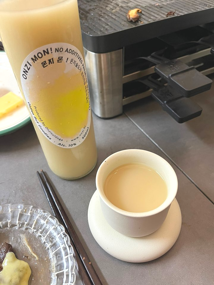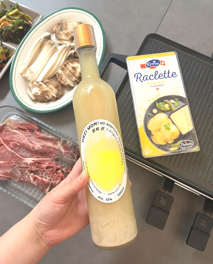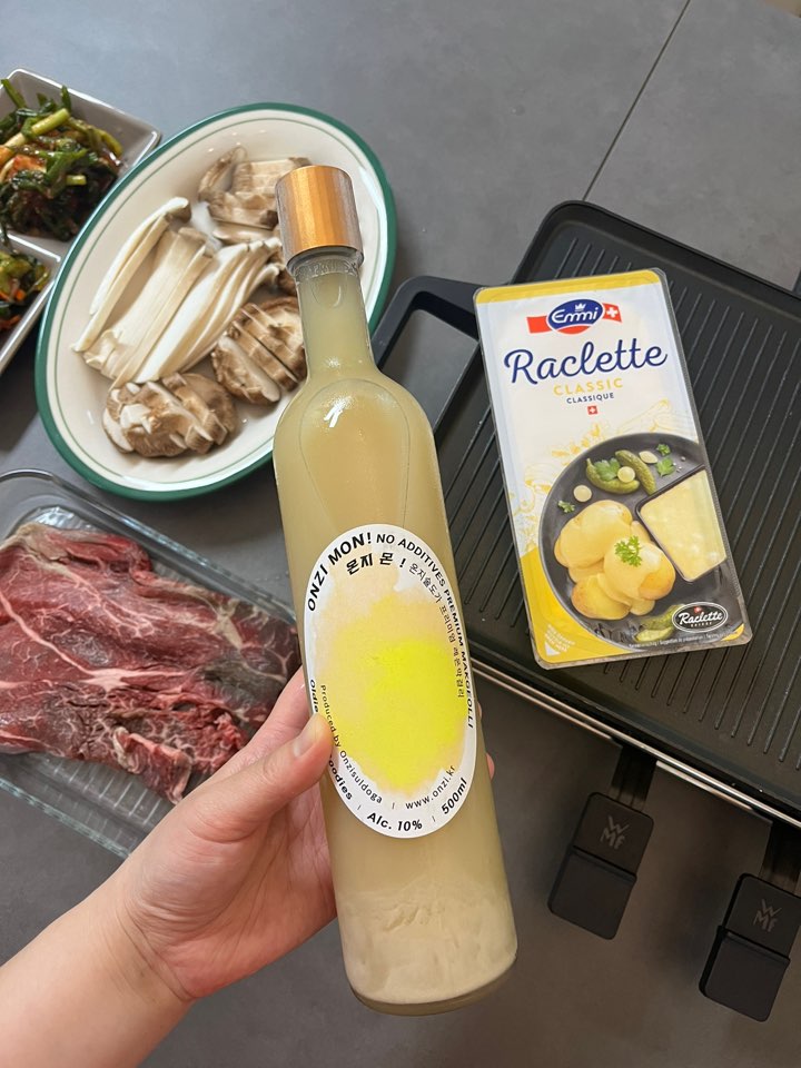 와인도 좋지만 상큼한 레몬 막걸리와 라끌렛도 아주 괜찮은 조합이었습니다. 라끌렛 치즈는 꼬릿꼬릿한 냄새와 풍미가 아주 좋은 치즈인데요. 꼭 이 라끌렛 전용 치즈를 구매해서 드시는 것을 추천합니다.
