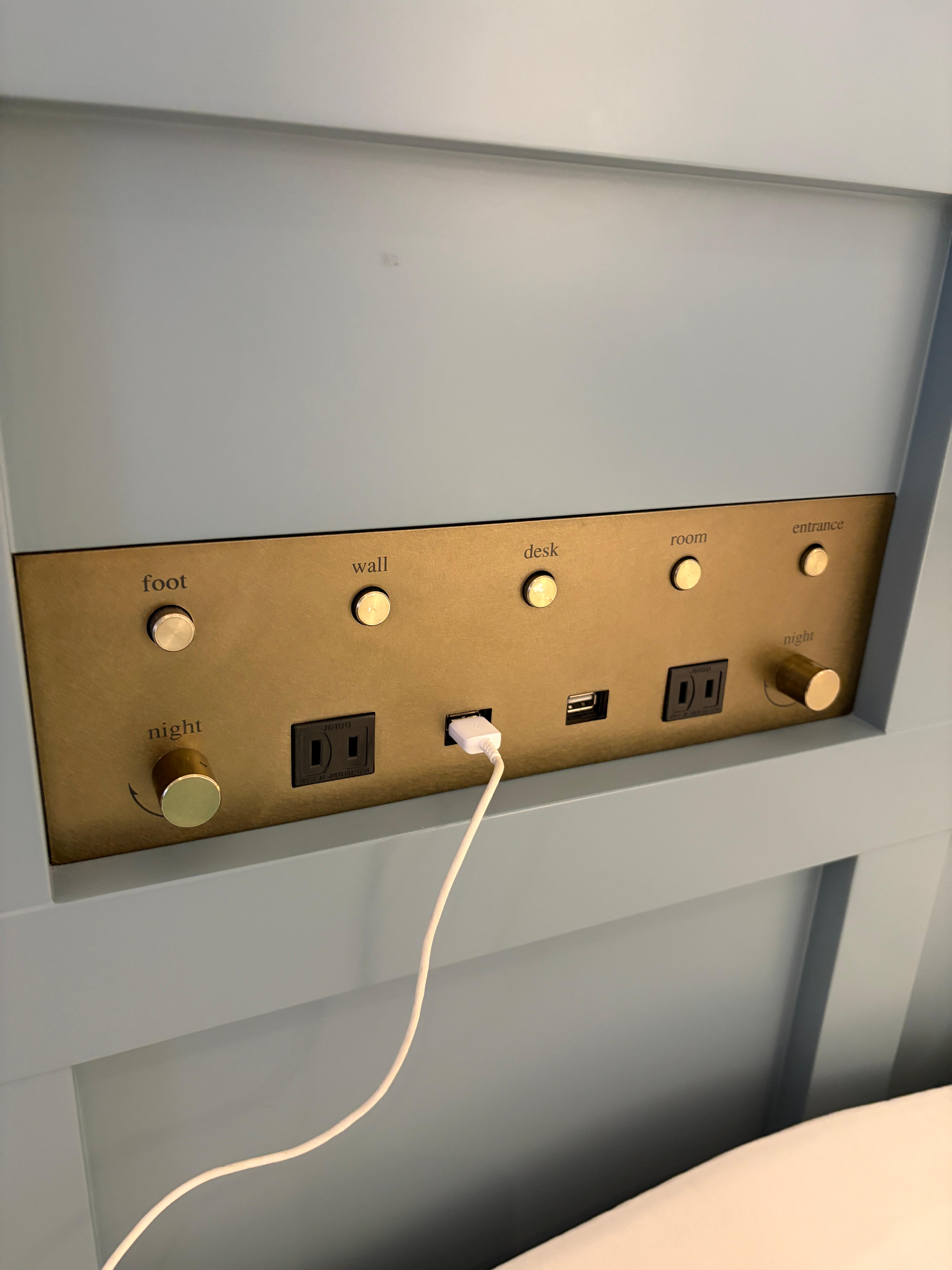 대부분 호텔들은 콘센트가 한 두 군데만 있는 곳이 많아서 멀티탭을 챙겨가곤 하잖아요. 그런데 여기는 콘센트에 진심인 호텔입니다. 하도 많아서 찍어봤어요.