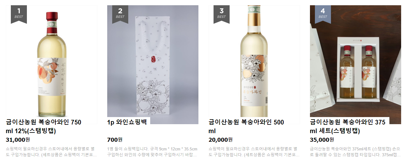 한국와인인 금이산농원의 복숭아와인은 전통주로 분류되기 때문에 온라인 구매가 가능합니다. 금이산 농원에서는 복숭아와인 이외에 사과와인, 오가피와인도 판매 중인데 지인 선물로 참 좋았습니다. 저도 실제로 여러 번 선물로 보냈었는데 모두들 만족하시더라고요. 이번 추석 선물용으로도 좋을 것 같아 구매 링크 첨부합니다.
