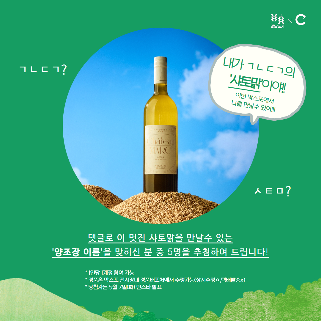 막스포 인스타그램 해당 게시물에 댓글로 샤토맑을 만날 수 있는 '양조장 이름'을 맞혀주세요. (5/6까지) 1인당 1 계정 참여 가능하며 당첨자(5명)는 5월 7일(화) 인스타를 통해 발표합니다.