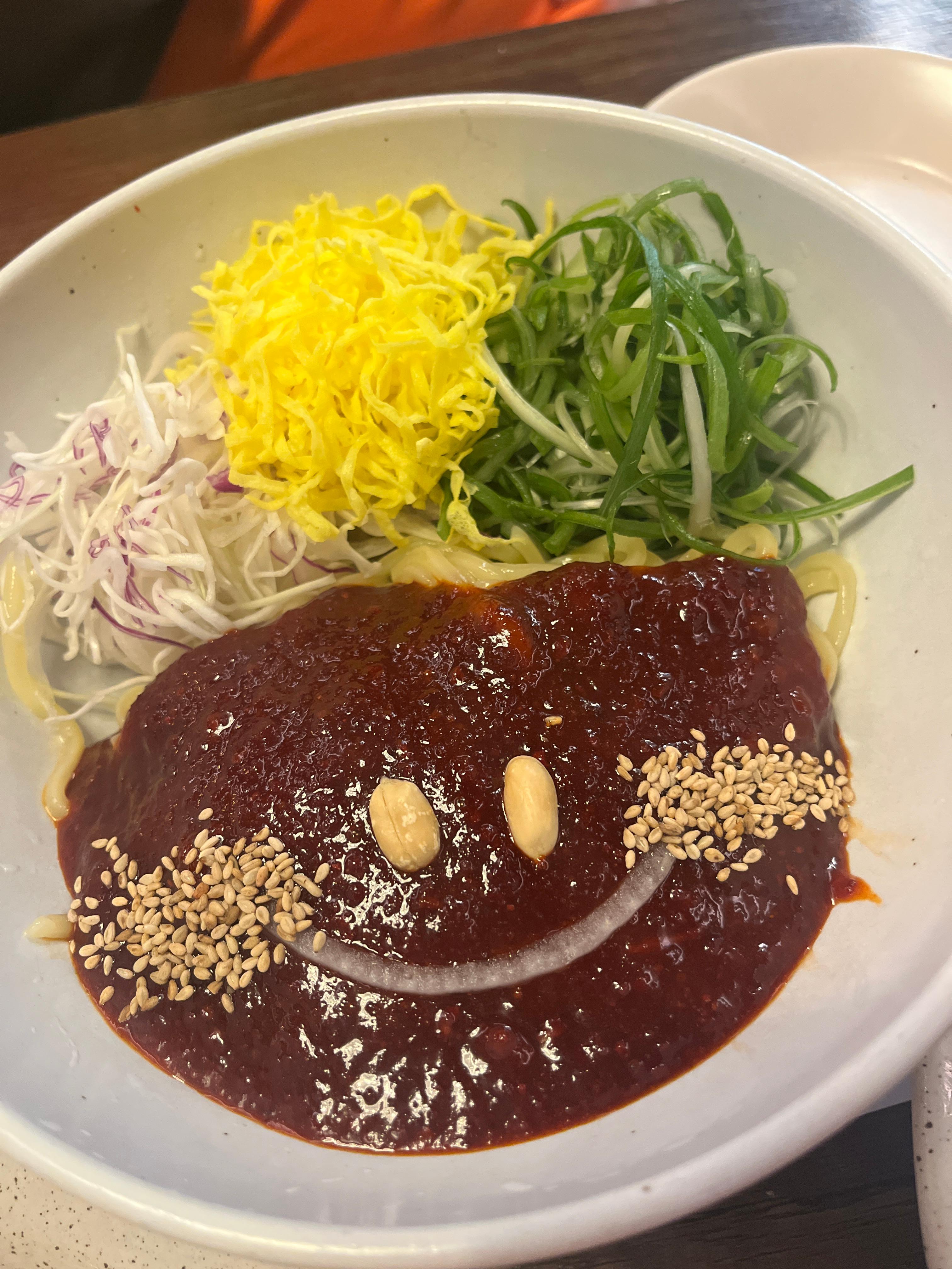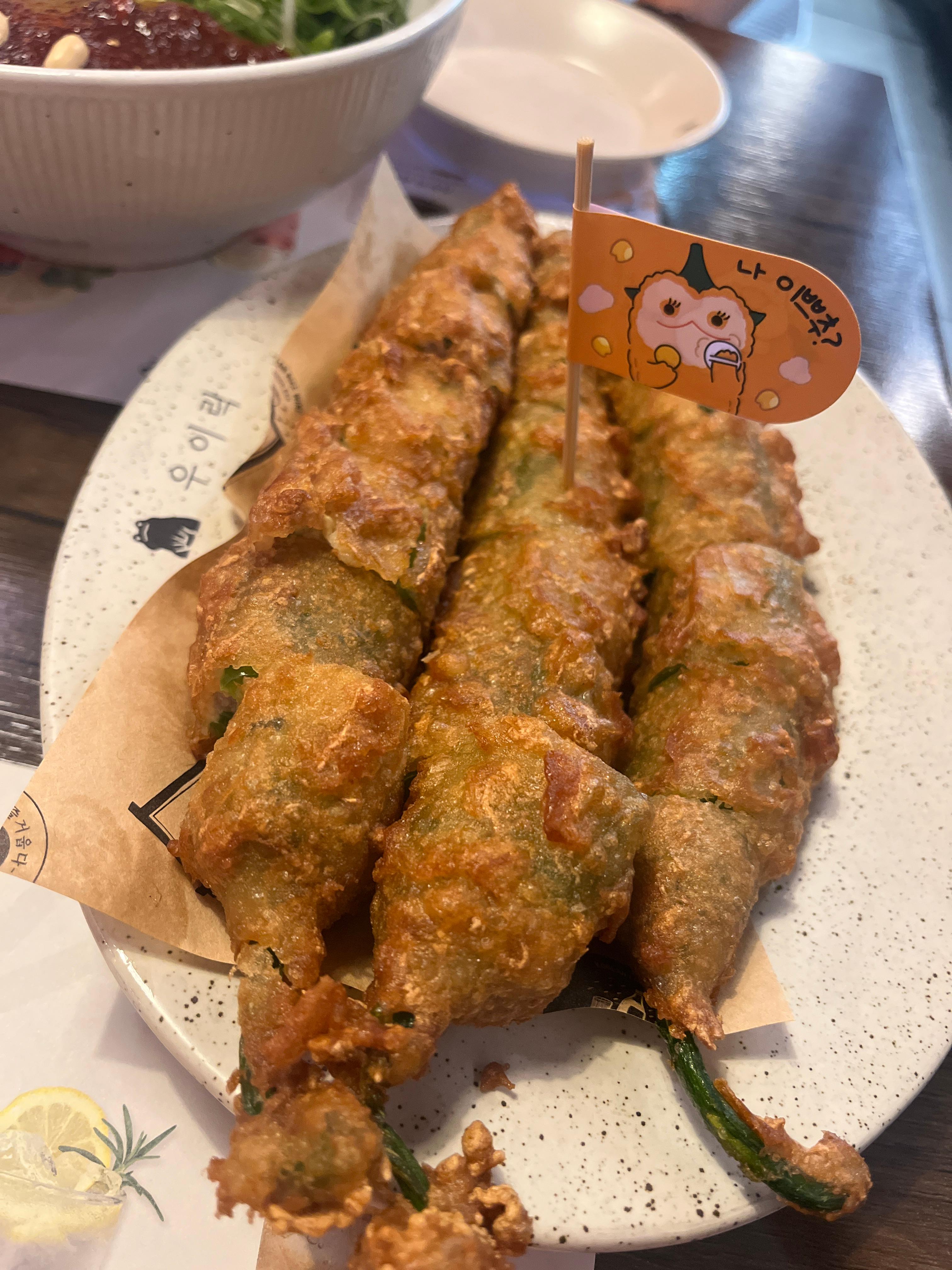 비빔국수는 새콤달콤한 맵지않은 비빔국수라서 좋았어요. 고추튀김과 육새전이 살짝 느끼해질때쯤 한 번씩 먹으면 잘 어울립니다.