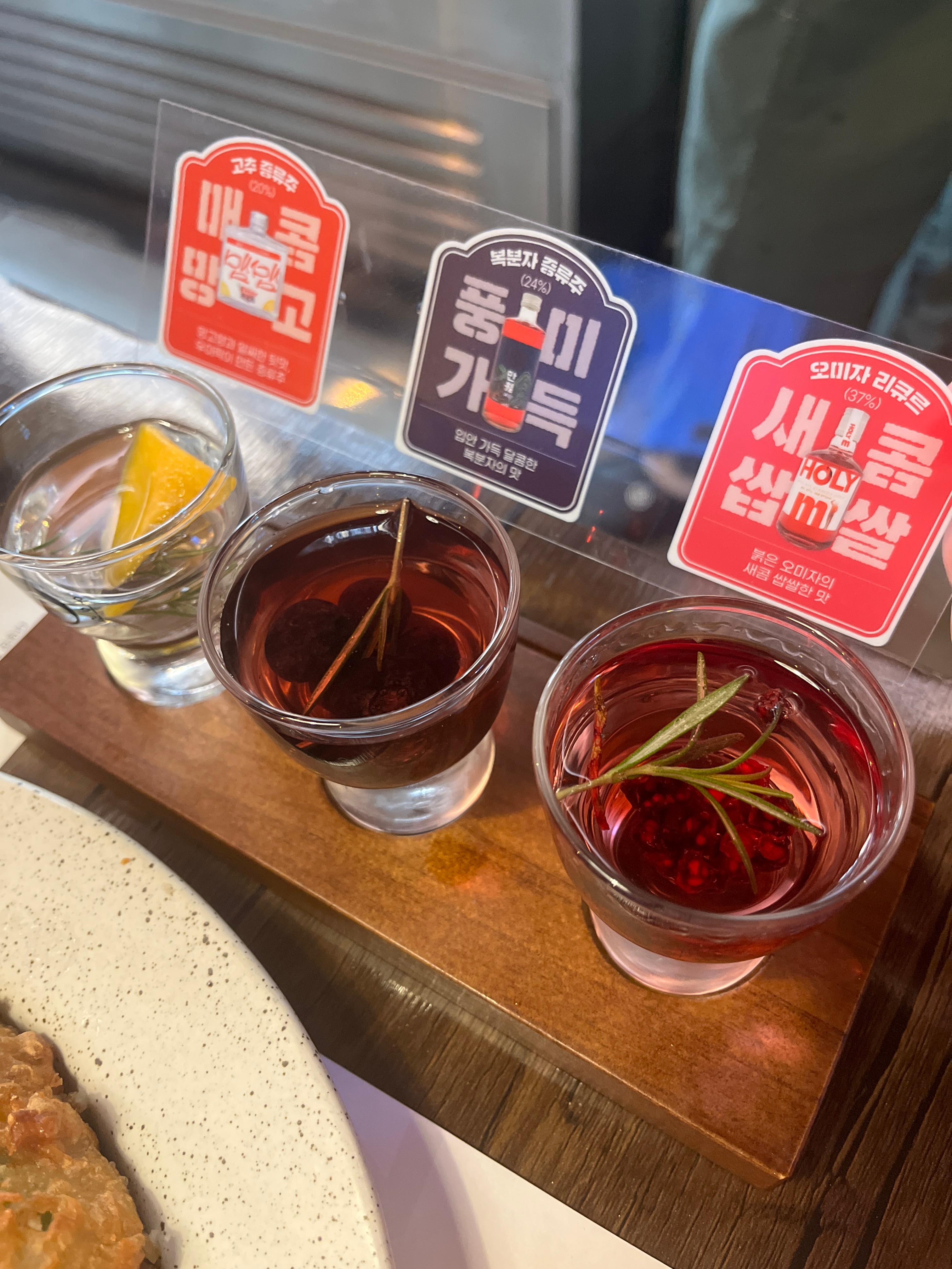의외로 오미자 리큐르인 홀리엠이 맛있었어요. 37도라 알콜 타격감이 꽤 있지만 여러가지 음식을 먹어 복잡해진 입 안을 오미자가 리프레쉬 해주는게 아주 매력적이더라고요. 도수가 높아서 다 마시지는 못했어요.