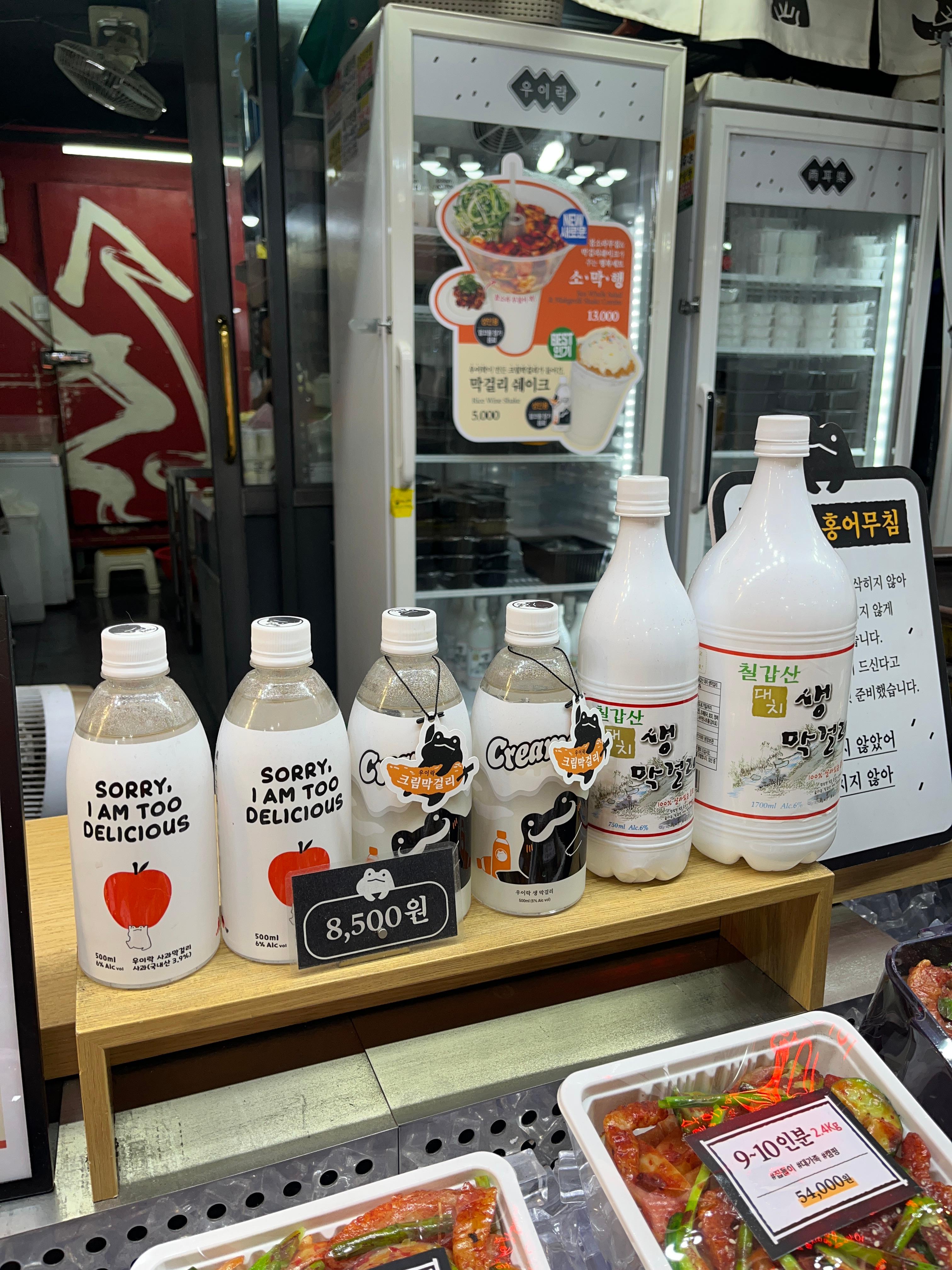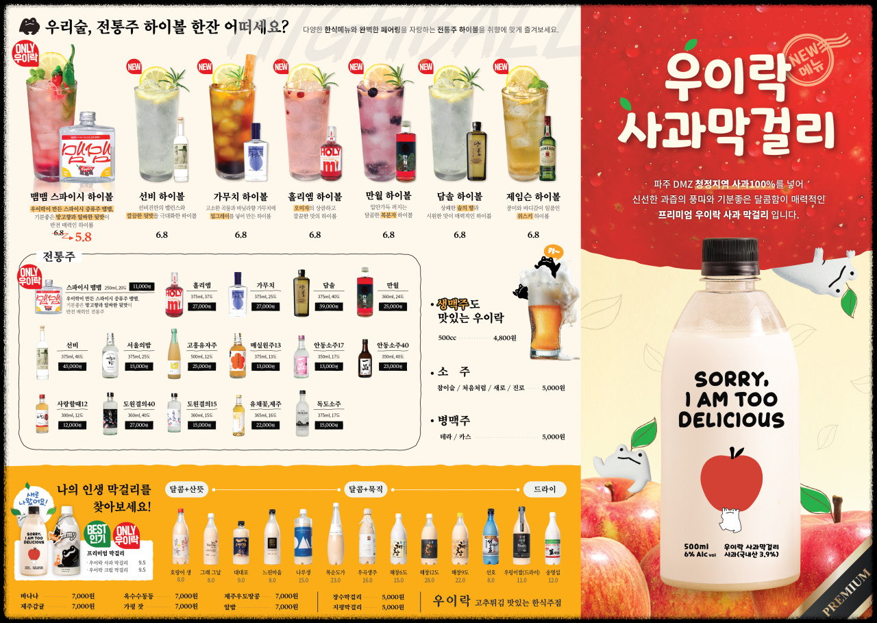 한식 주점답게 전통주 라인업이 굉장히 화려해요! 우이락 크림 막걸리와 우이락 사과막걸리를 제일 많이 드시는 것 같고 메뉴판 이미지에는 없지만 증류주 샘플러도 있습니다. 전통주를 안좋아하는 분들도 생맥주, 소주가 있으니 걱정마세요!