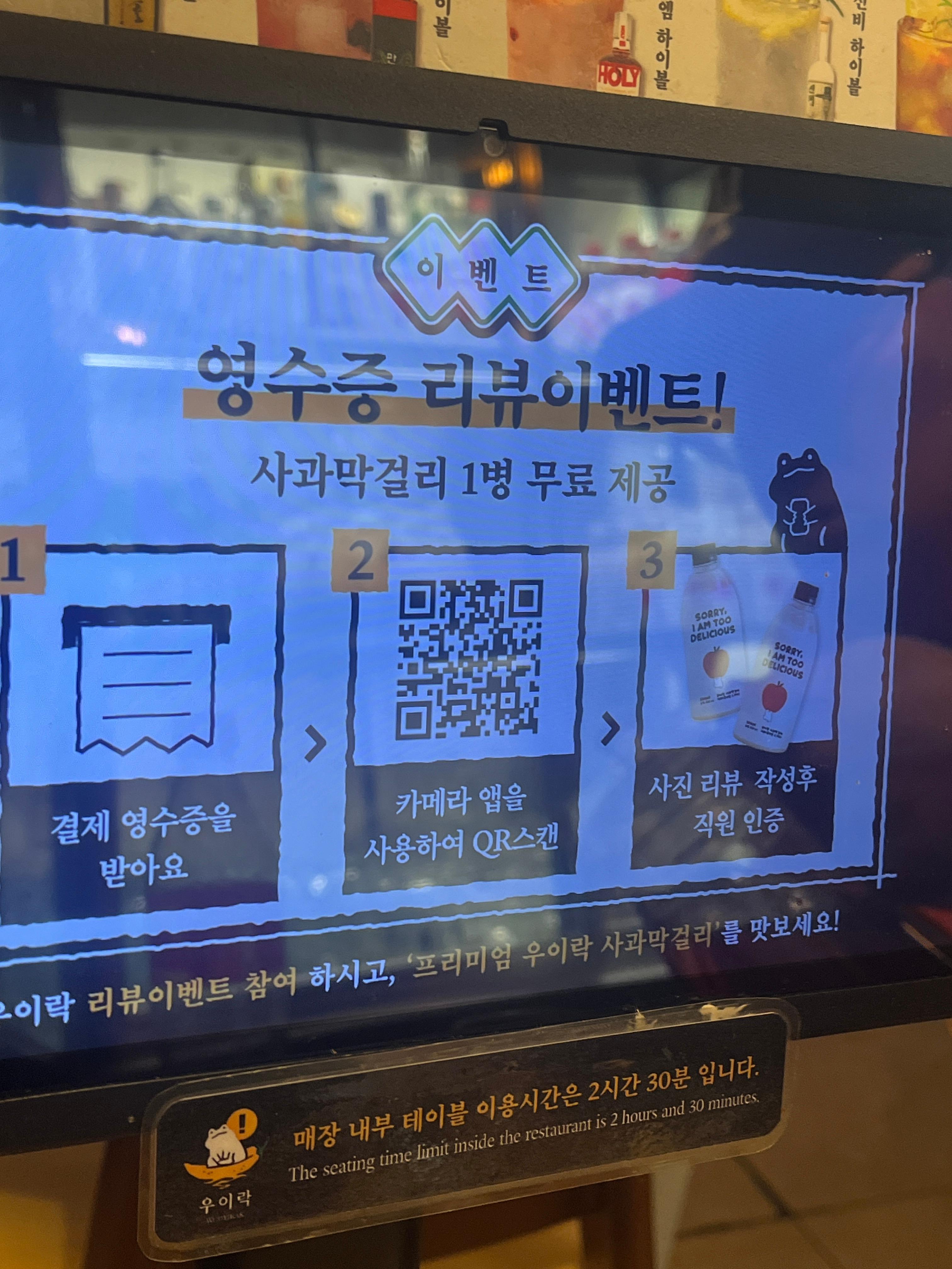 네이버 영수증 리뷰를 작성하면 우이락 사과막걸리를 한 병 무료로 제공해줍니다. 처음에 한 잔인줄 알고 안했다가 한 병이길래 바로 참여했어요. 탄산감없이 가볍고 달달한 사과맛 나는 막걸리입니다.