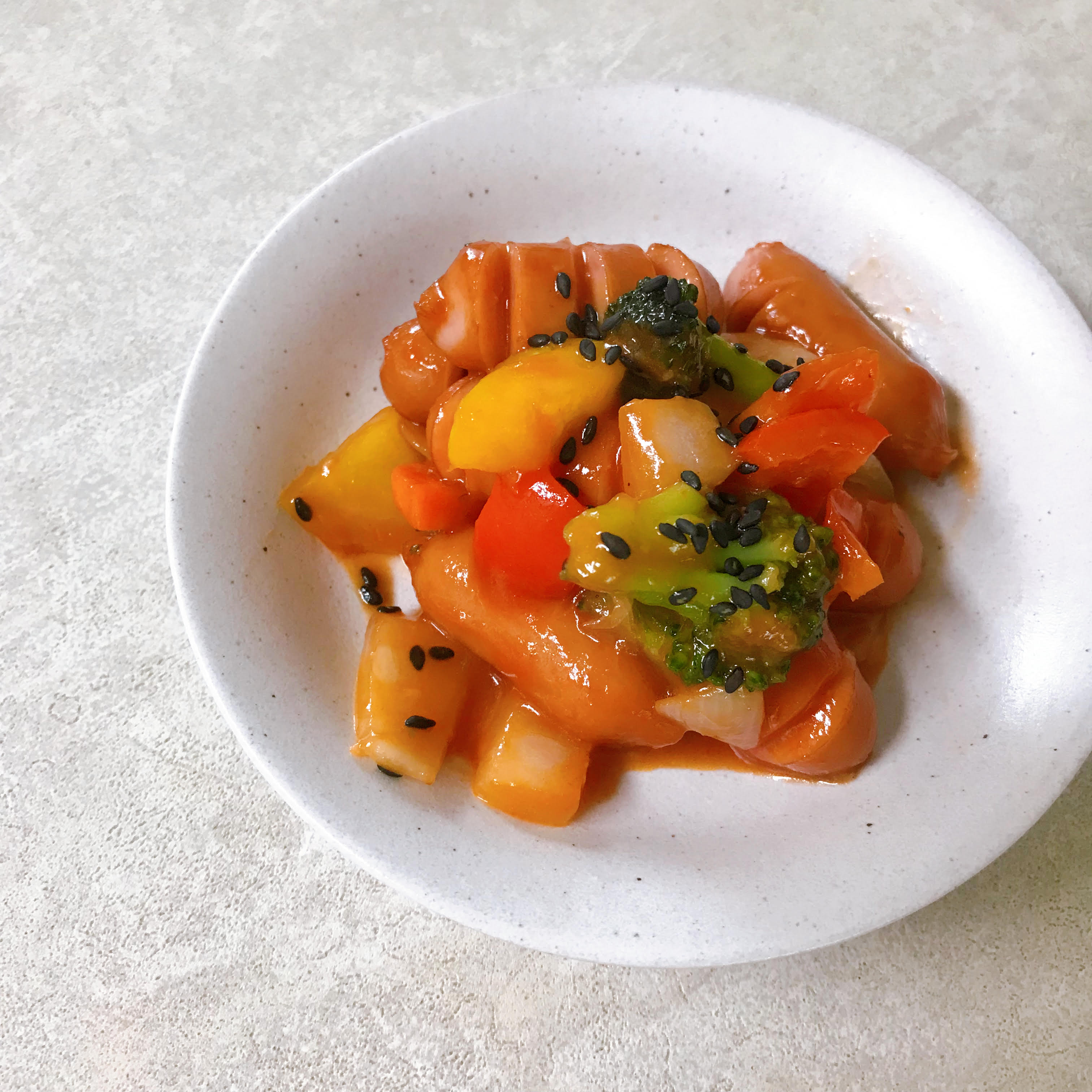 재료: 비엔나소시지 한 봉지, 다진 마늘, 파프리카, 브로콜리, 양파, 케첩 3T, 올리고당 1T, 굴소스 1/4T, 맛술 1/2T, 마요네즈 1/2T, 식용유, 깨