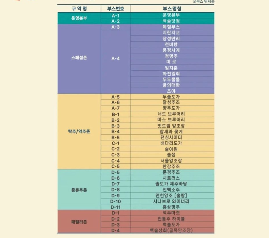 탁주, 약주, 증류주, 맥주 등 다양한 종류의 술을 만나볼 수 있습니다. 물에 가둔 불 크루, 백술도가 양조장 등 참가하는 업체는 아래 표를 참고해 주세요. 또한 대한민국 명주 대상 출품작을 전시하고 소주 부문 출전자들의 소줏고리 시연도 직접 볼 수 있다고 합니다.
