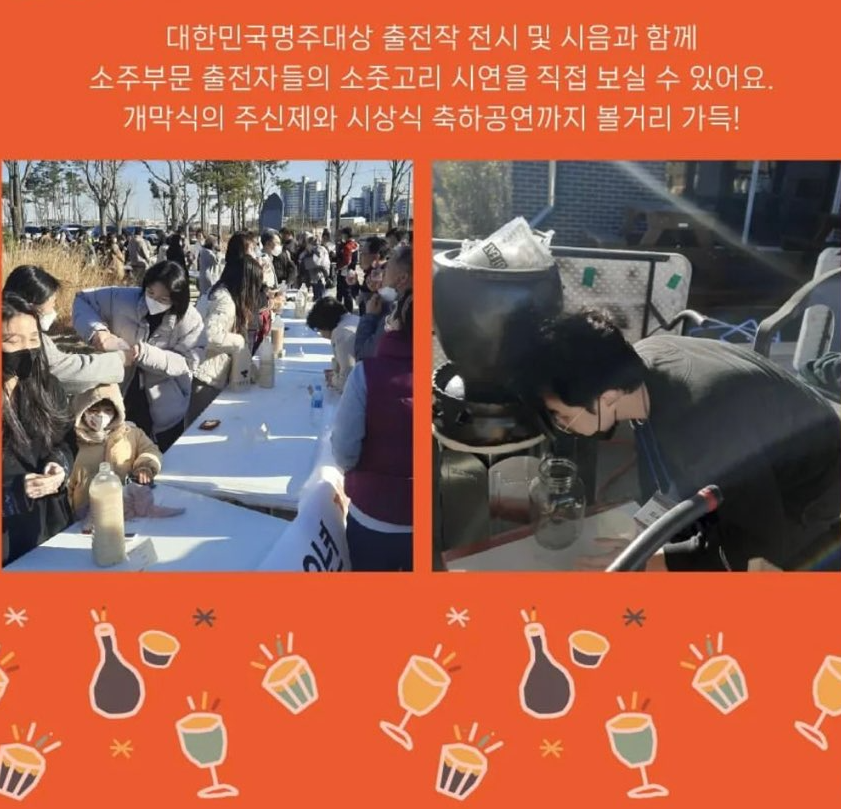 탁주, 약주, 증류주, 맥주 등 다양한 종류의 술을 만나볼 수 있습니다. 물에 가둔 불 크루, 백술도가 양조장 등 참가하는 업체는 아래 표를 참고해 주세요. 또한 대한민국 명주 대상 출품작을 전시하고 소주 부문 출전자들의 소줏고리 시연도 직접 볼 수 있다고 합니다.