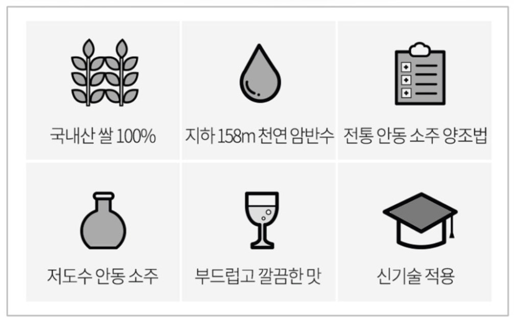 쌀 소주는 특유의 화근 냄새 때문에 거부감을 느끼는 사람들이 있다고 해요. 양조장 특유의 신기술로 화근 냄새를 잡았으며 보다 편안하게 안동 소주를 즐길 수 있도록 도수를 30도로 낮추었다고 합니다.